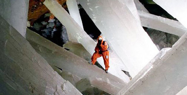 Los cristales de Selenita (sulfato de calcio) de la Mina de Naica en Chihuahua, México son los más grandes del planeta, llegando a medir 12 metros de longitud y 2 metros de diámetro. La mina fue descubierta desde 1794 pero su explotación formal a gran escala empezó hasta 1900. Actualmente es operada por Grupo Peñoles y extrayendo plomo, zinc, cobre , plata y oro, llegando a procesar casi un millón de toneladas de mineral al año. La cueva de los cristales fue descubierta apenas en el año 2000. Está a una profundidad cercana a 300 m. La temperatura alcanza los 60° y la humedad es cercana al 100% por lo que sólo se puede permanecer en la cueva unos minutos. http://www.mexicodesconocido.com.mx/las-10-cuevas-mas-espectaculares-de-mexico.html http://ngm.nationalgeographic.com/2008/11/crystal-giants/shea-text
